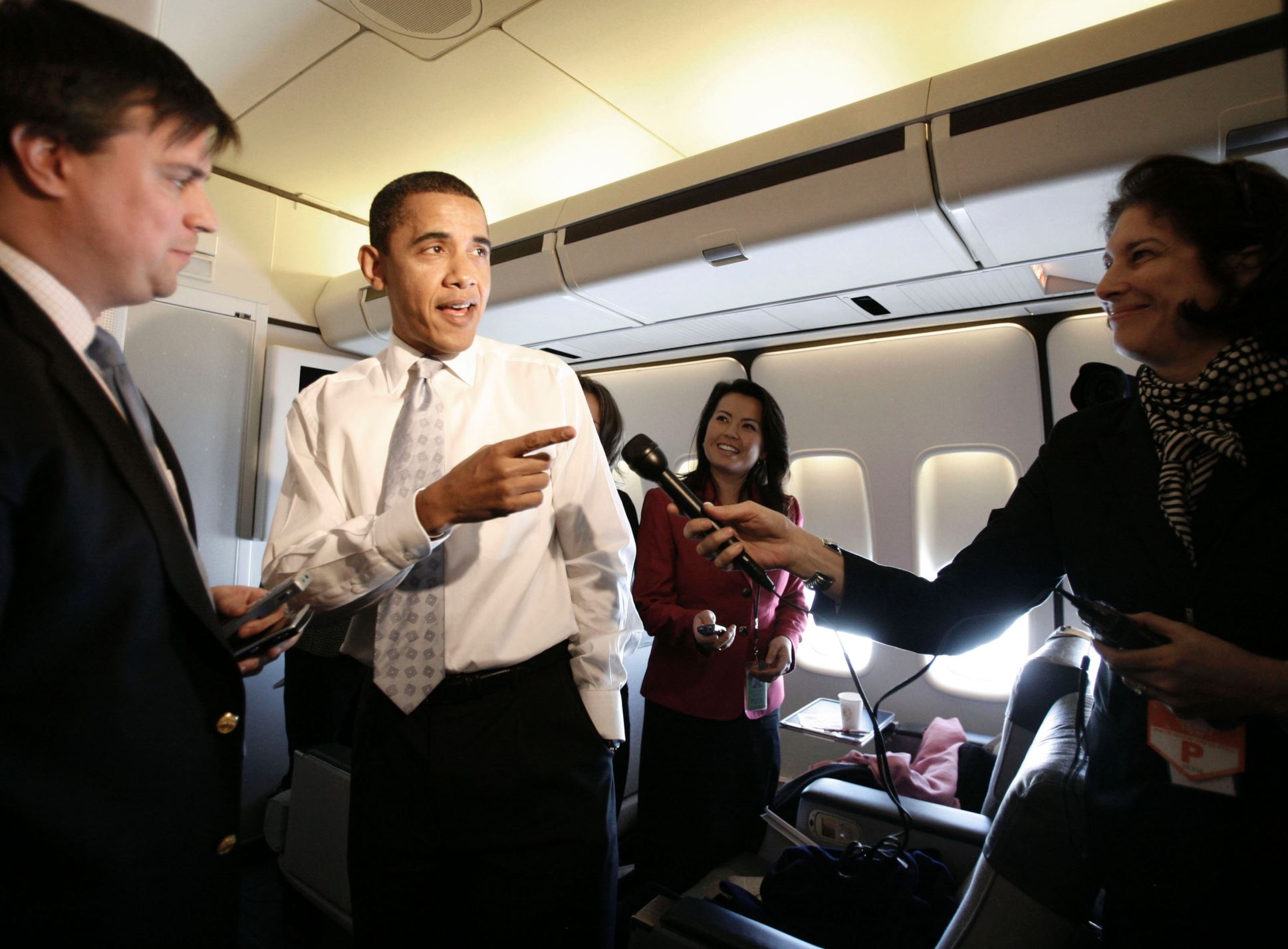 U.S. President Barack Obama speaks to the press as he walks through the press cabin aboard Air Force One