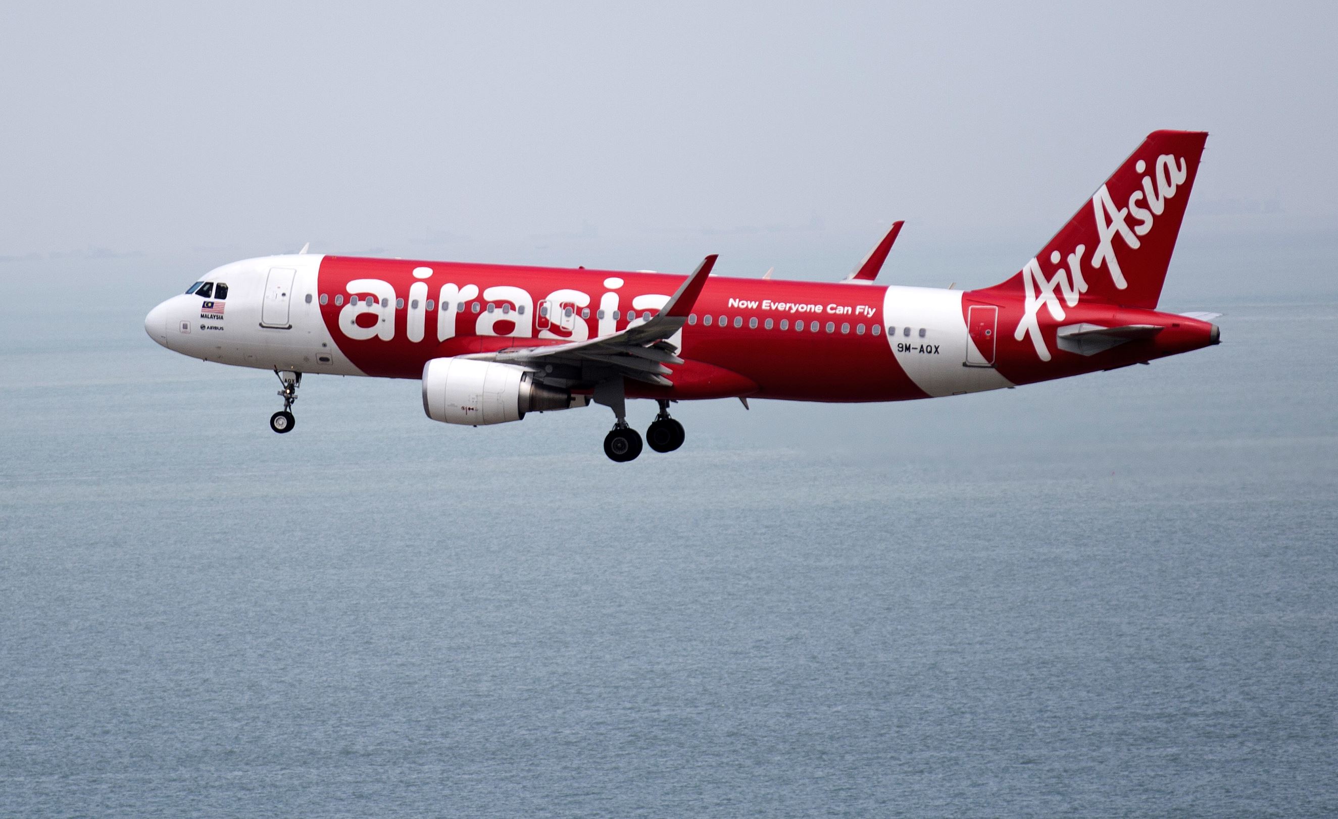 An AirAsia aircraft approaches Hong Kong International Airport in Hong Kong, China, on Tuesday, Aug. 12, 2014. Brent Lewin/Bloomberg