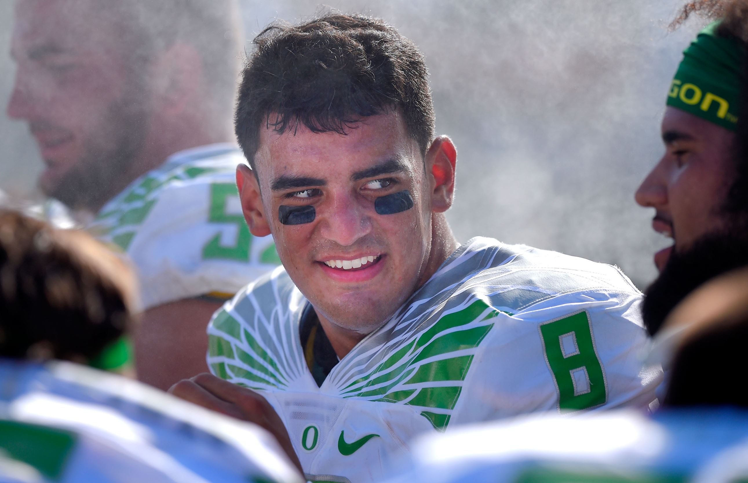 © Mark J. Terrill/AP Photo Oregon quarterback Marcus Mariota talks to teammates on the bench during the first half of a NCAA college football game against UCLA, Saturday, Oct. 11, 2014, in Pasadena, Calif.