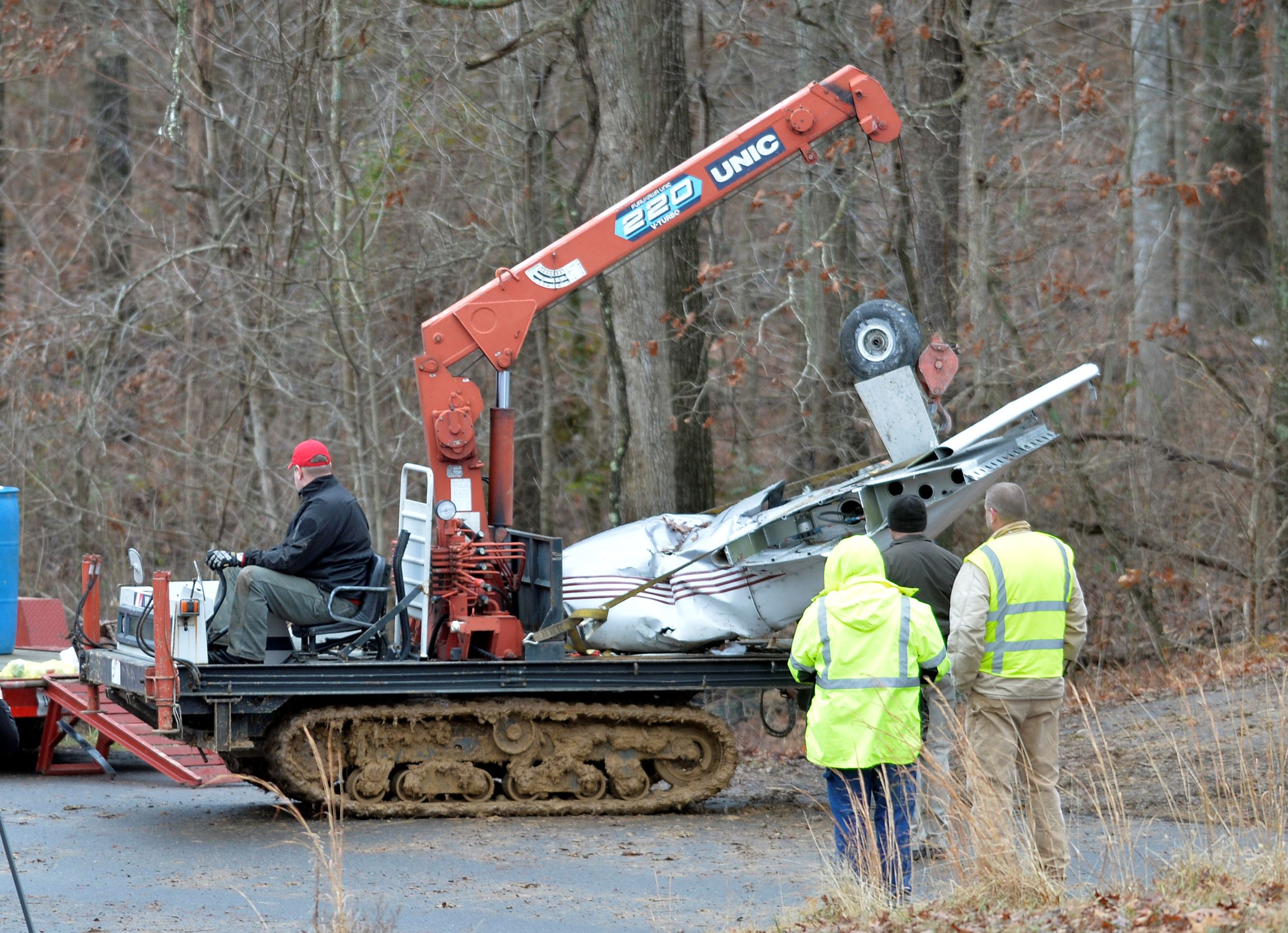Workers remove a small aircraft from a crash site, Jan. 4, 2015 in Kuttawa, Ky.