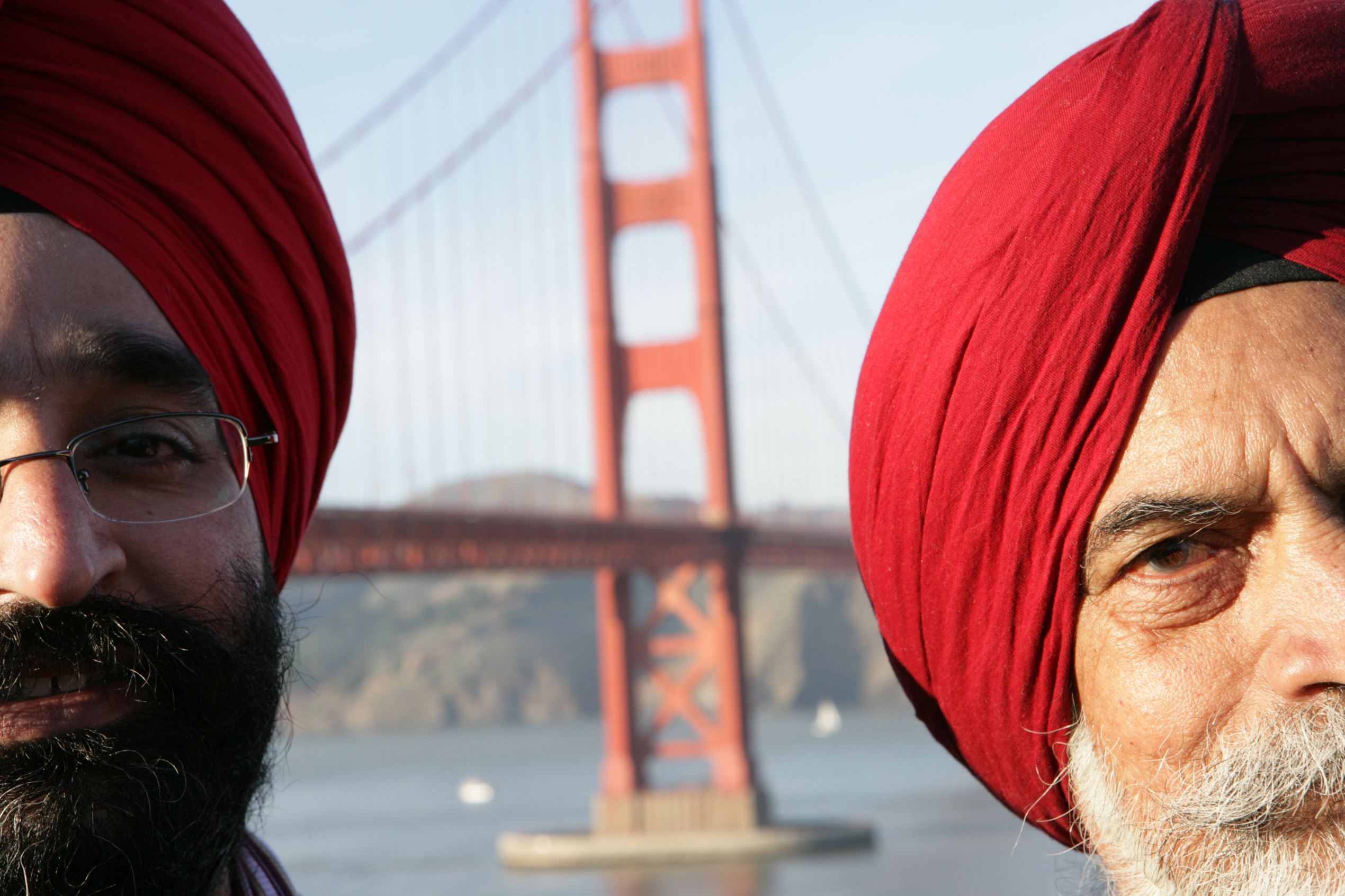 Two men wearing turbans near the Golden Gate Bridge.
