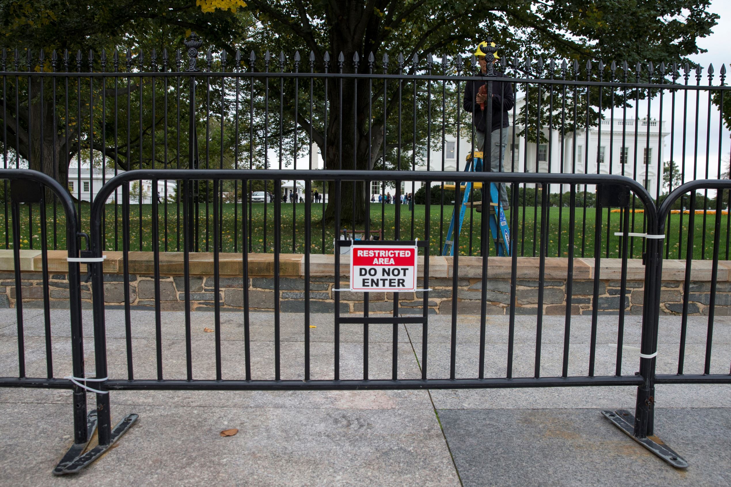With a second fence in the foreground, a maintenance worker performs fence repairs at the White House in Washington, Thursday, Oct. 23, 2014, as part of a fence restoration project.