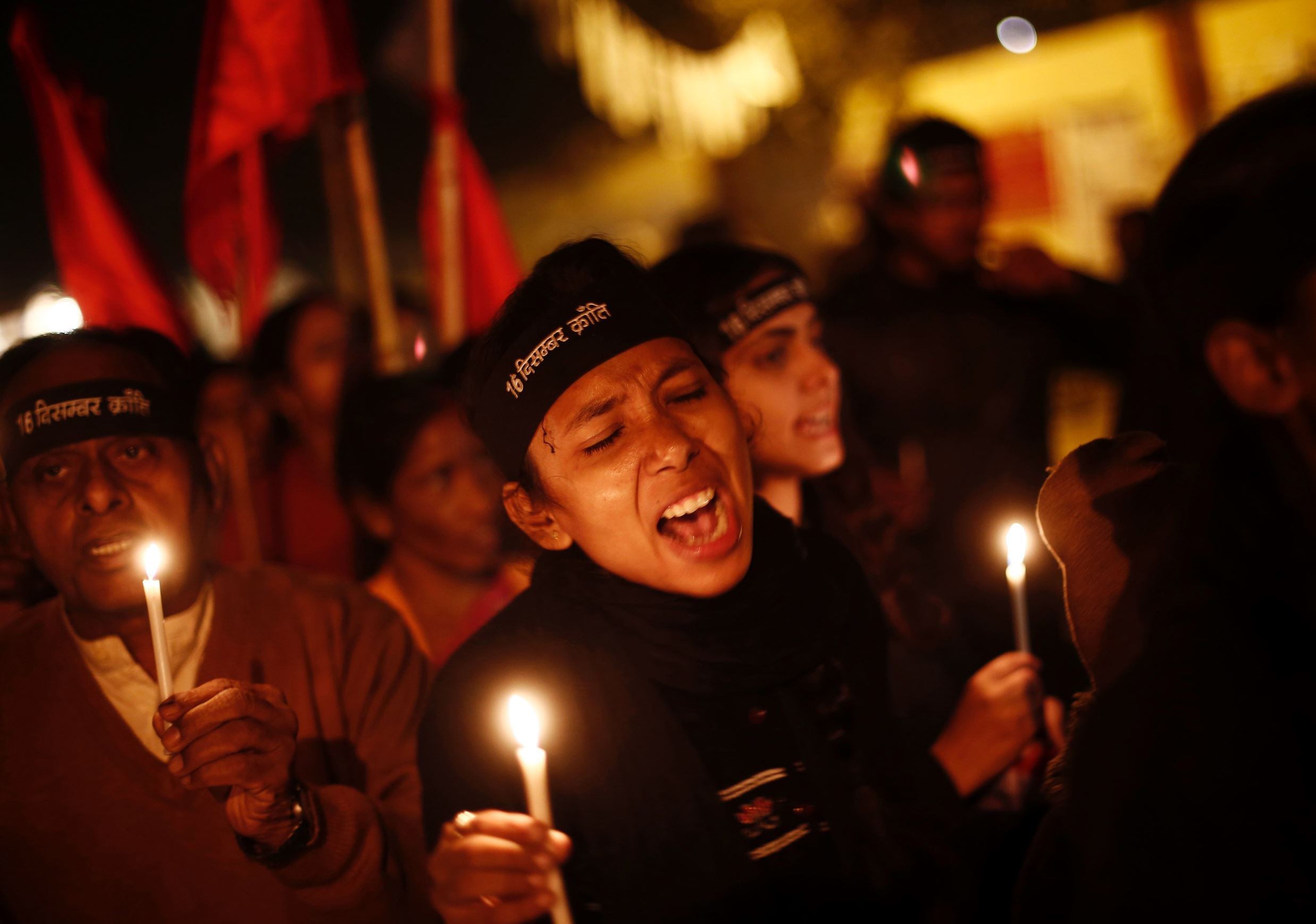 Protestors shout slogans as they hold candles during a candle light vigil to mark the first anniversary of the Delhi gang rape, in New Delhi, December 16, 2013.