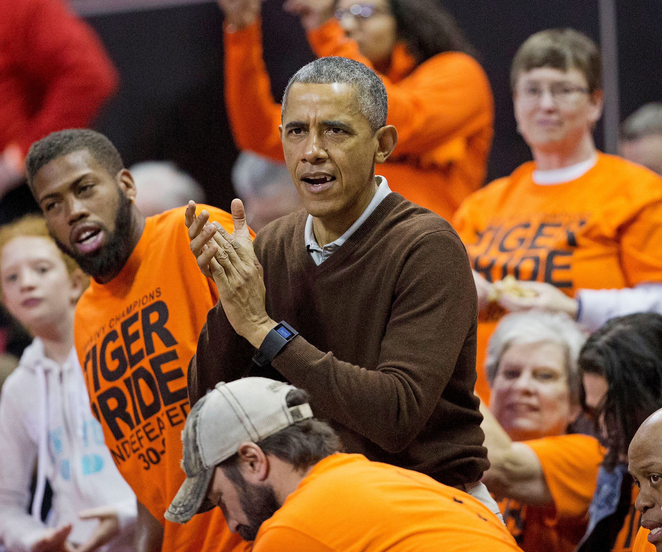President Barack Obama cheers at the Princeton game against Wisconsin-Green Bay