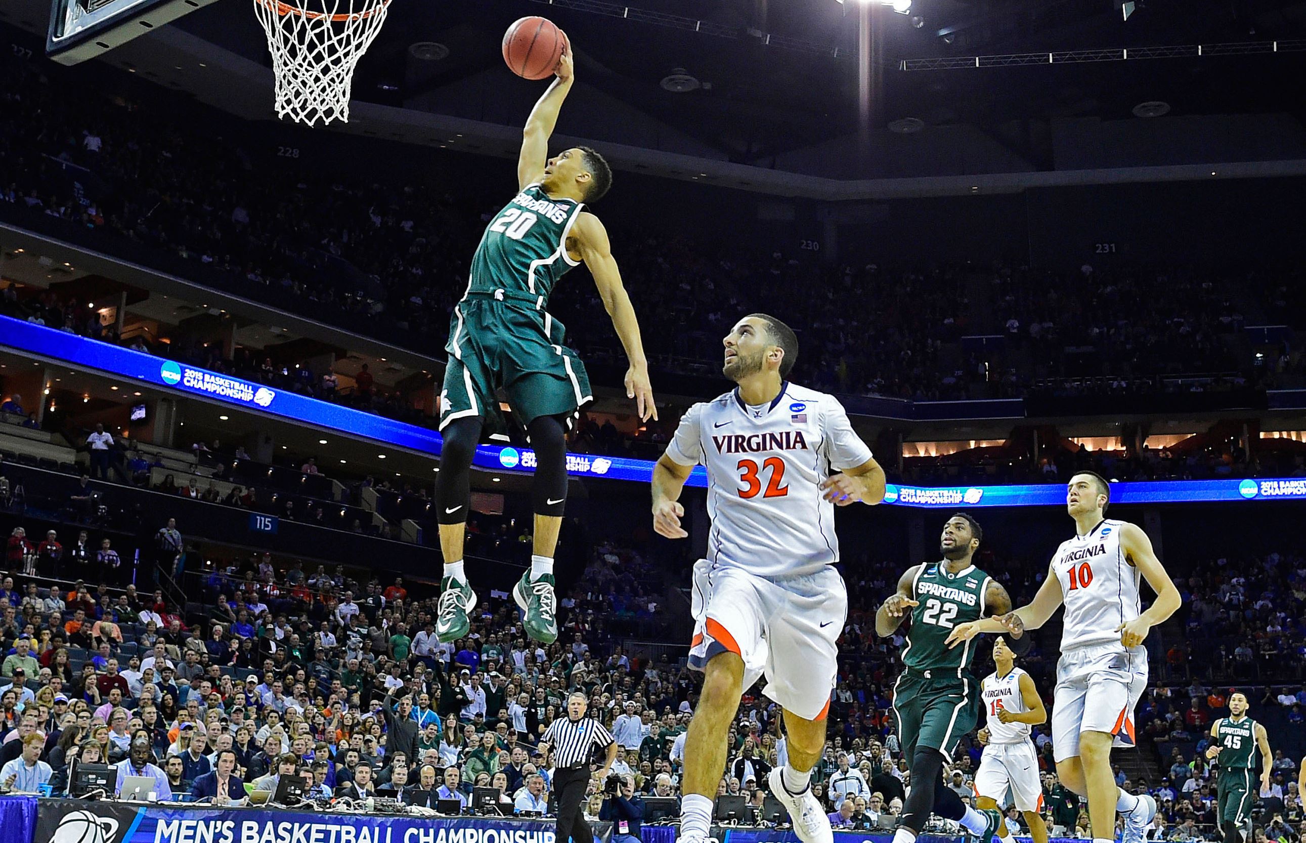 Michigan State Spartans guard Travis Trice (20) dunks the ball against Virginia Cavaliers guard London Perrantes (32) during the first half in the third round of the 2015 NCAA…