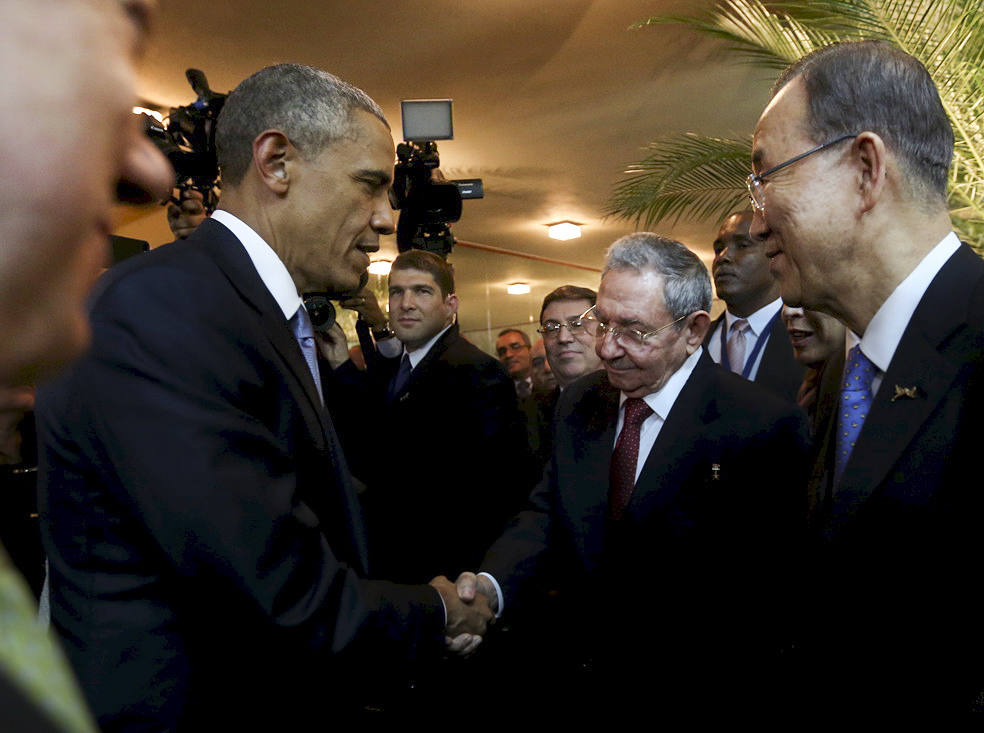 © Panama Presidency/Handout/Reuters President Barack Obama and his Cuban counterpart Raul Castro shake hands as U.N. Secretary General Ban Ki-moon looks on, before the inauguration of the VII Summit of the Americas in Panama City, April 10, 2015.