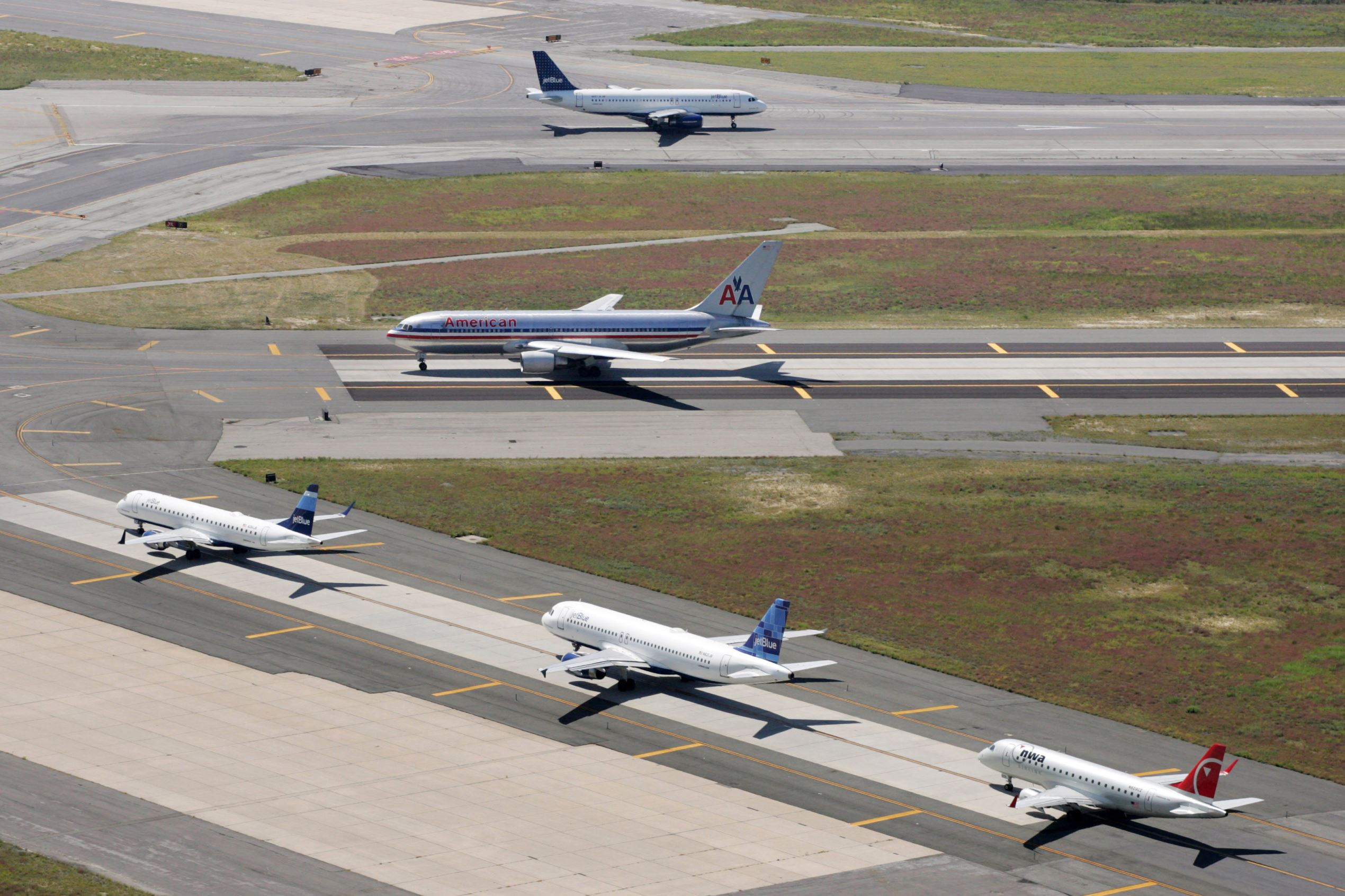 FILE - planes taxi on runways at John F. Kennedy International Airport in New York. Mark Lennihan/AP