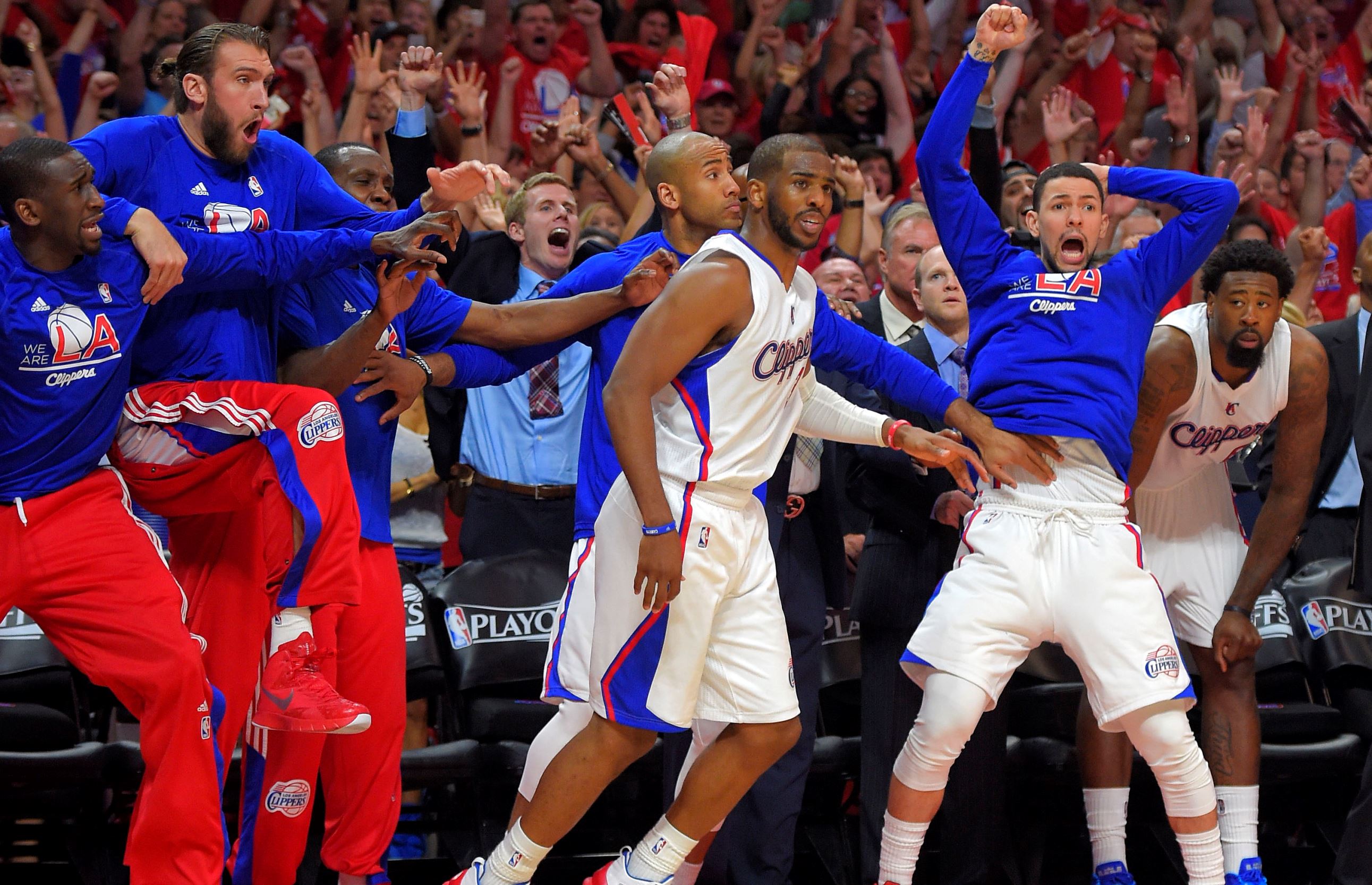 Members of the Los Angeles Clippers bench celebrate after guard Chris Paul, center, hit a basket with a second left in second half of Game 7 in their playoff series against the San Antonio