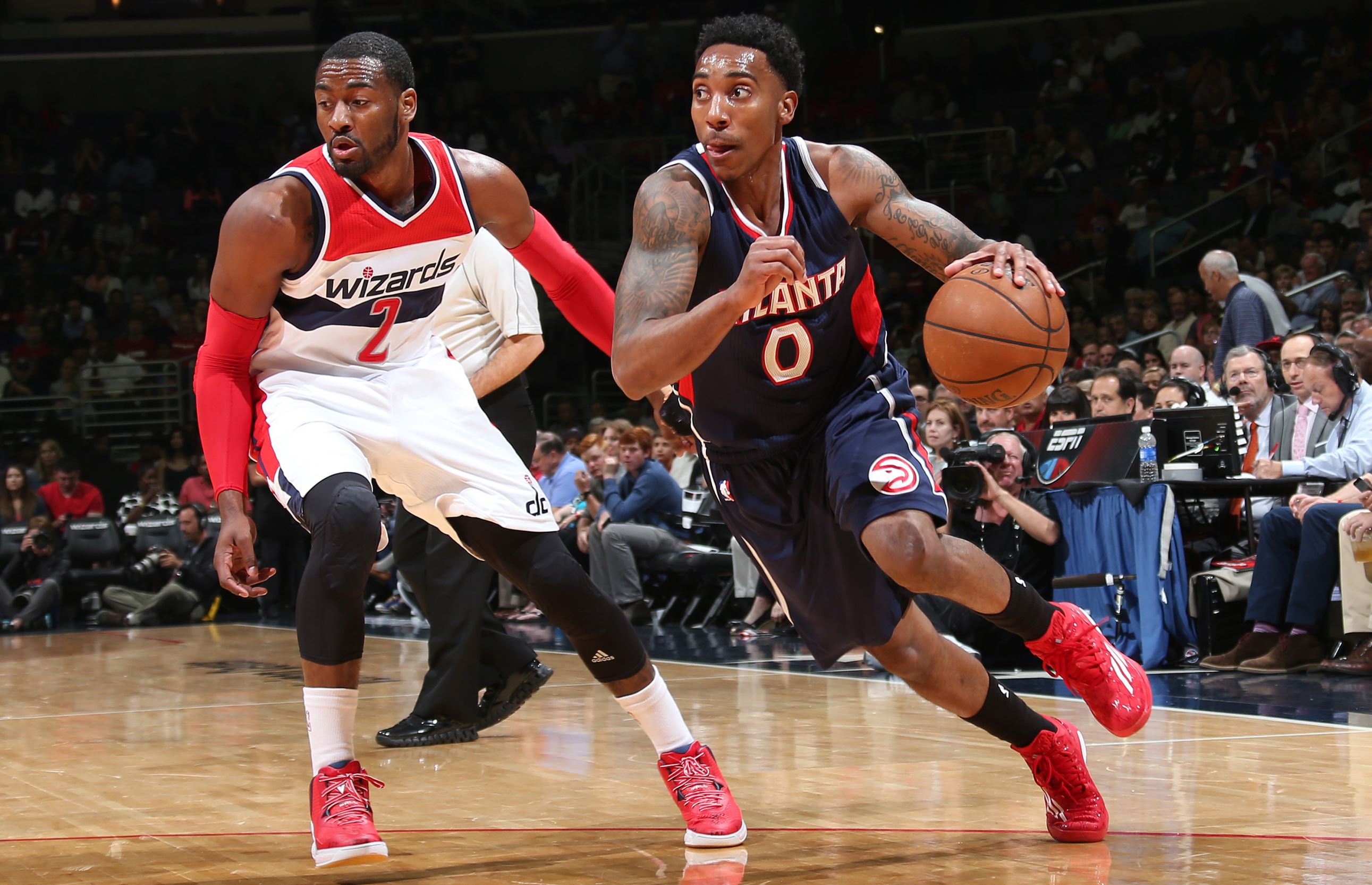 Jeff Teague of the Atlanta Hawks handles the ball against the Washington Wizards in Game Six of the Eastern Conference Semifinals of the 2015 NBA Playoffs at the…