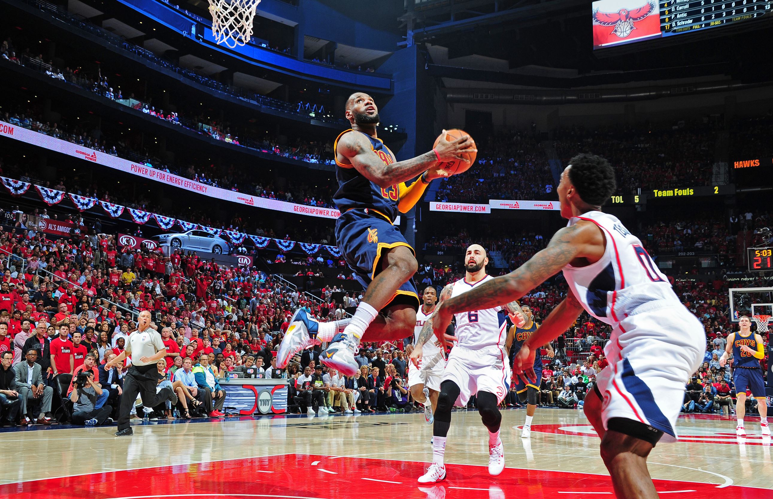 LeBron James of the Cleveland Cavaliers goes for the lay up against the Atlanta Hawks during Game One of the Eastern Conference Finals during the NBA Playoffs on…