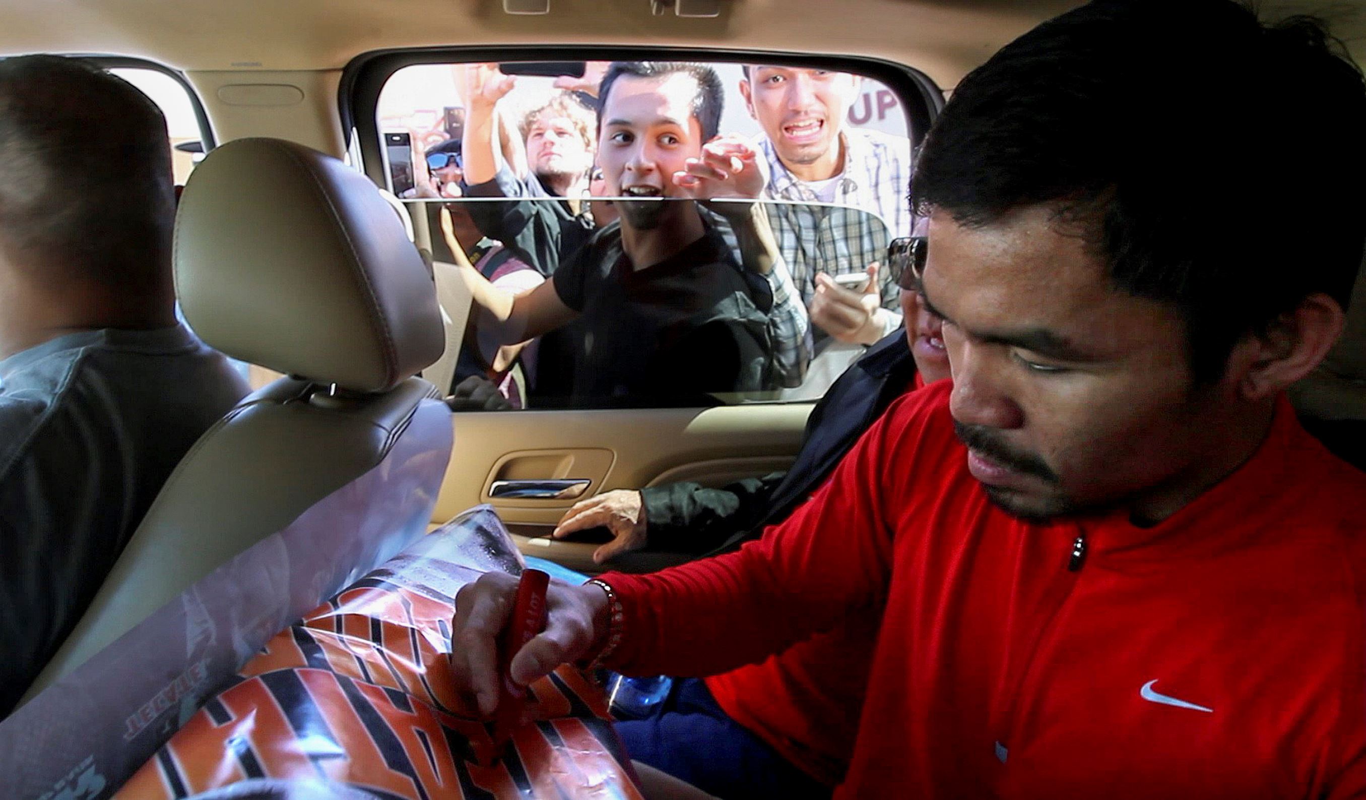 Manny Pacquiao signs a poster for a fan as he leaves Wild Card Boxing Gym in Hollywood after his last workout before heading to Las Vegas on Monday…