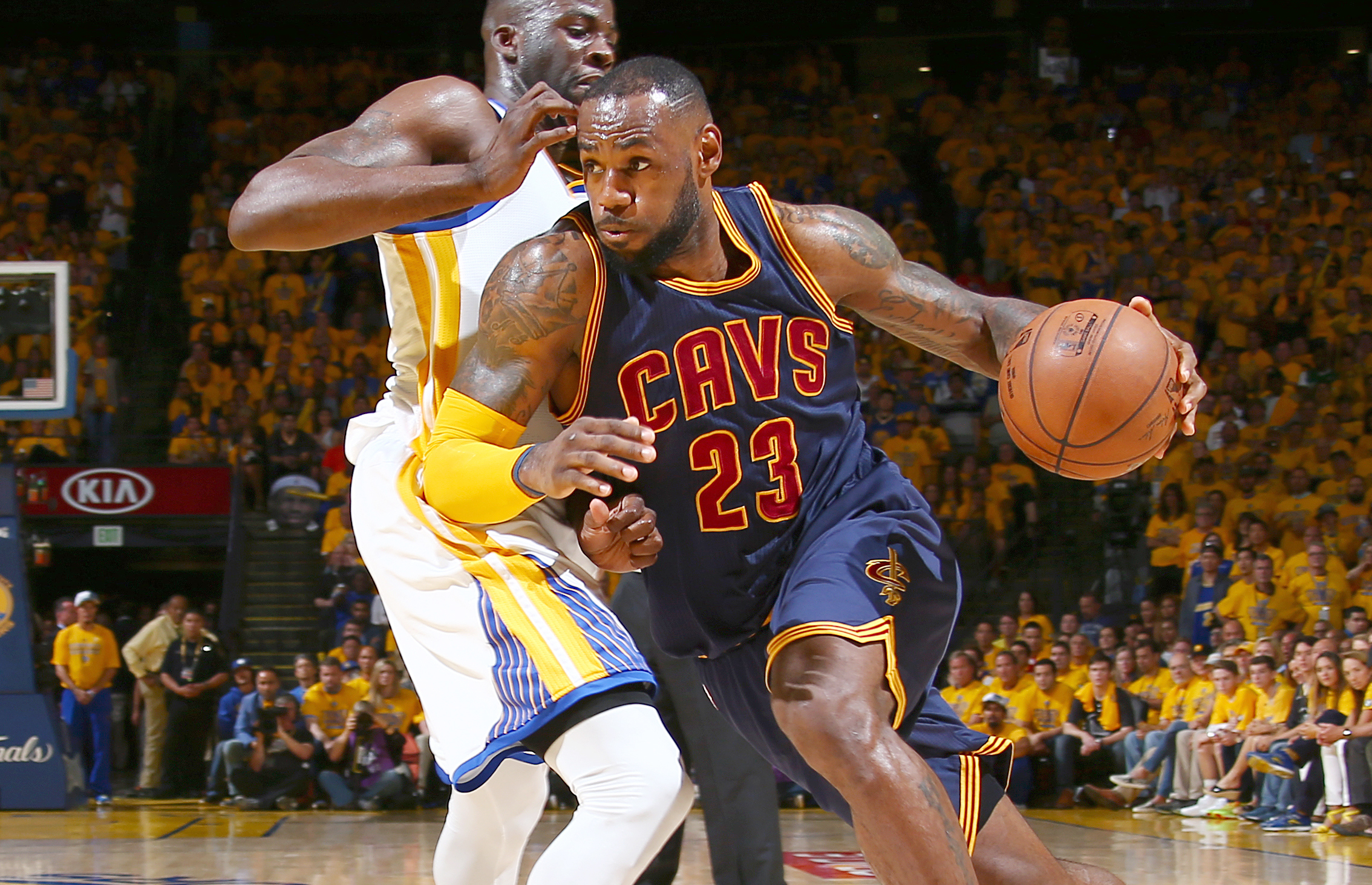 LeBron James #23 of the Cleveland Cavaliers drives against Draymond Green #23 of the Golden State Warriors during Game Two of the 2015 NBA Finals on June 7