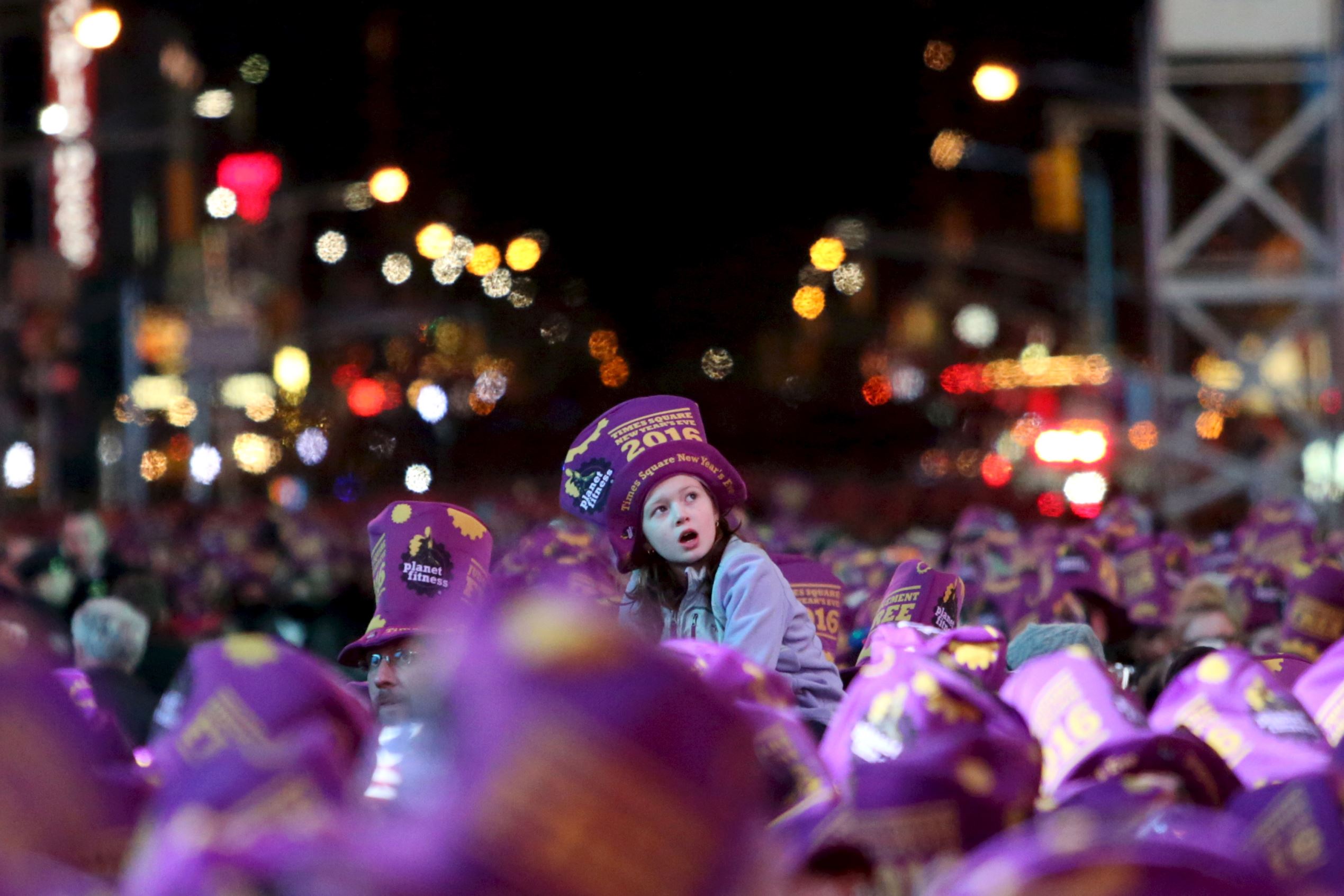 A child is lifted above the crowd during New Year celebrations in Times Square in the Manhattan borough of New York December 31, 2015. REUTERS/Andrew Kelly
